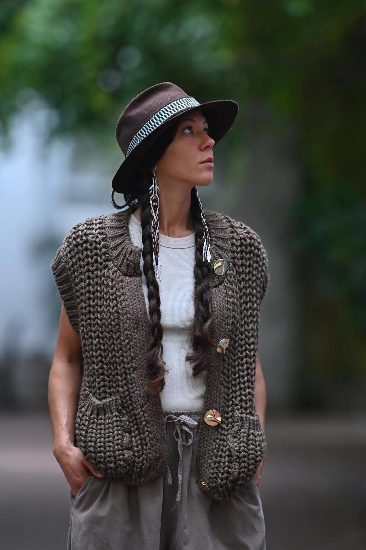 Kahverengi Düğme Detaylı Örme Yelek