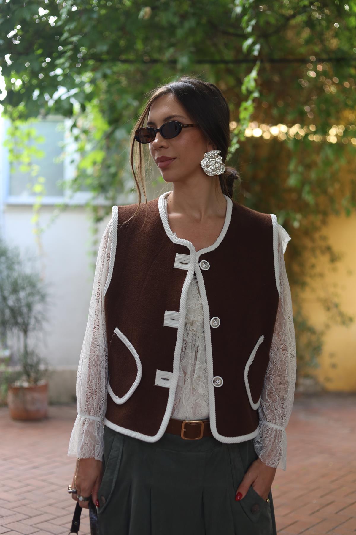 Kahverengi Fitil Detaylı Yumuşak Doku Yelek