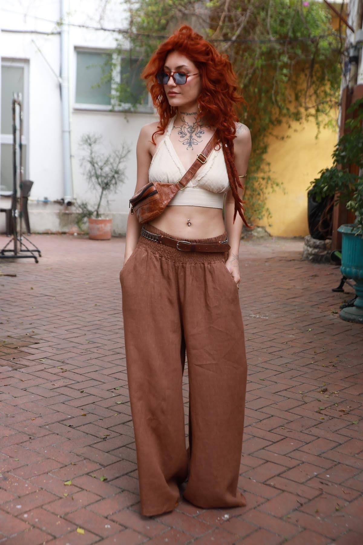 Kahverengi Geniş Paça Beli Gipeli Keten Pantolon