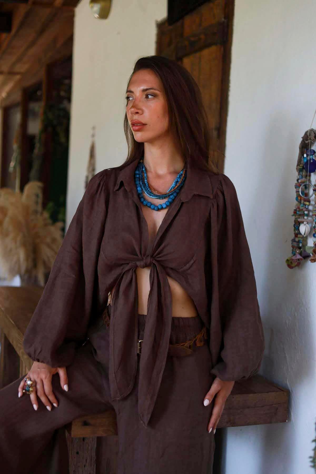 Kahverengi Keten Bolero ve Pantolon Takım