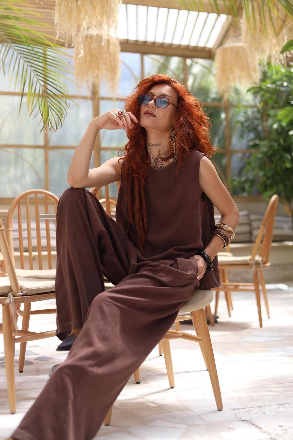 Kahverengi Kolsuz Keten Bluz ve Pantolon Takım