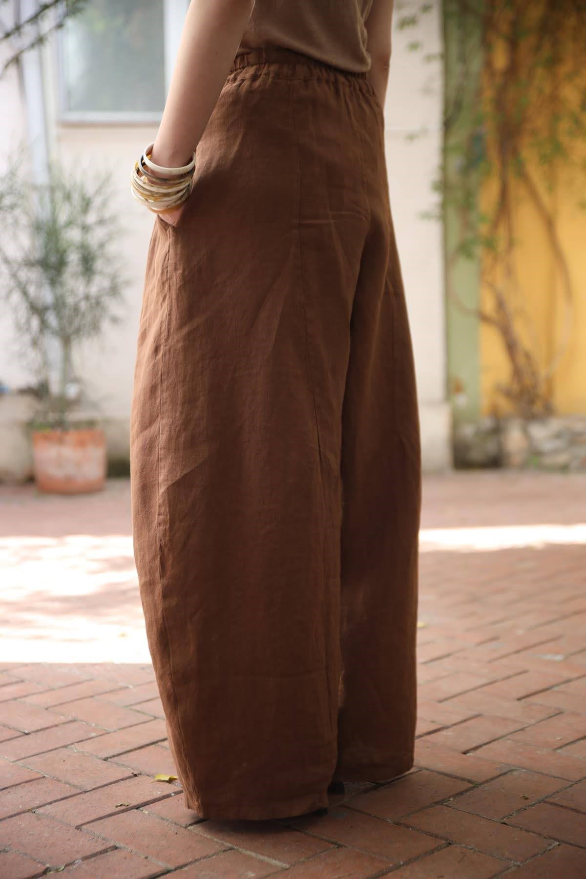 Kahverengi Pileli Bol Paça Keten Pantolon