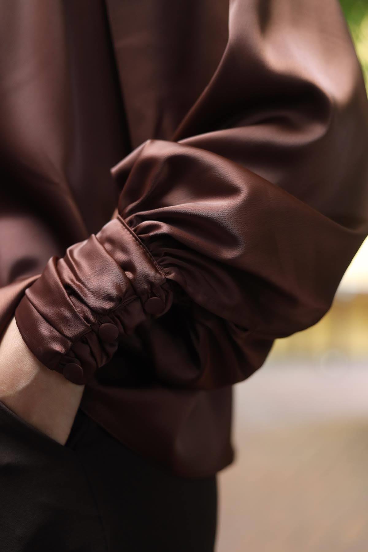 Kahverengi Pileli Saten Şık Bluz