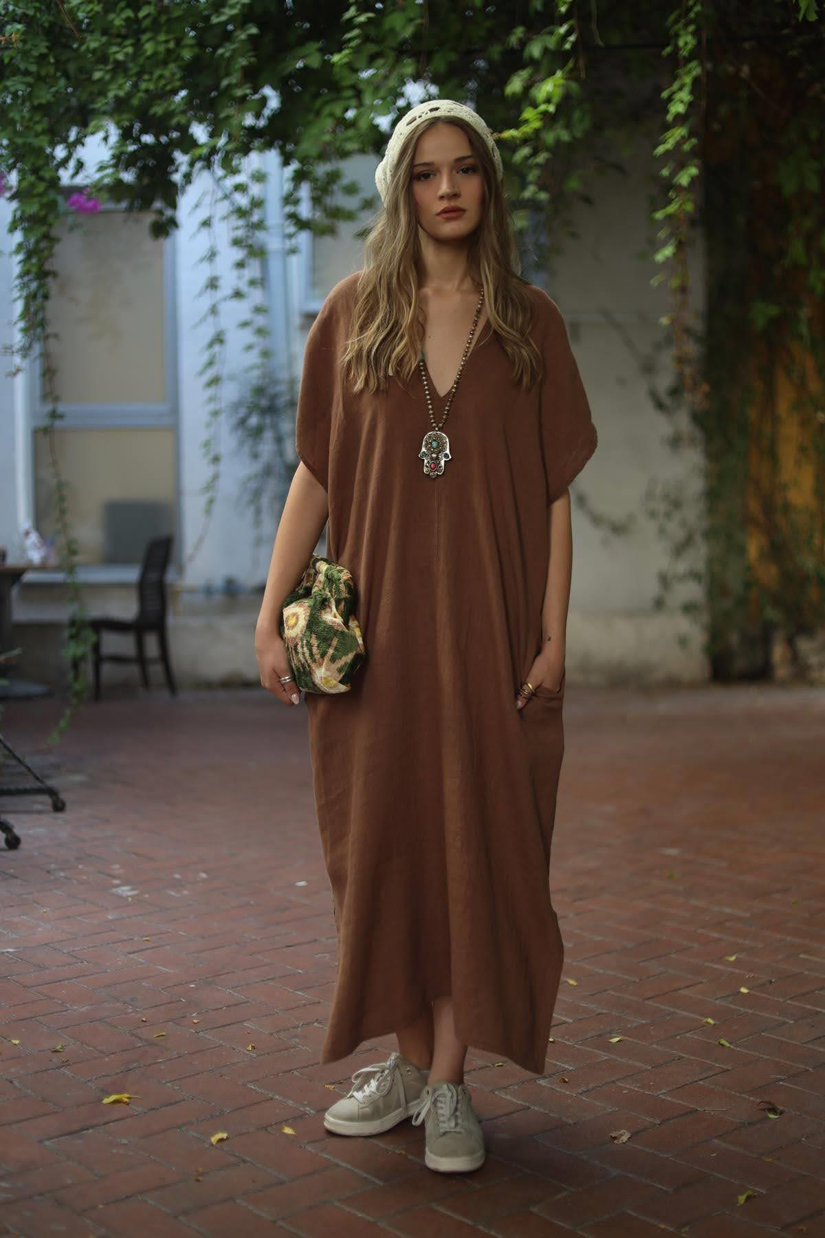 Kahverengi Sırtı Bağlamalı Yırtmaçlı Keten Elbise