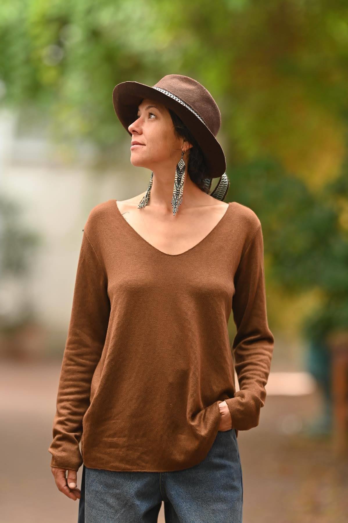 Kahverengi V Yaka İçi Leopar Desenli Triko Bluz (KB-PM-018-VI-KA1-STD)