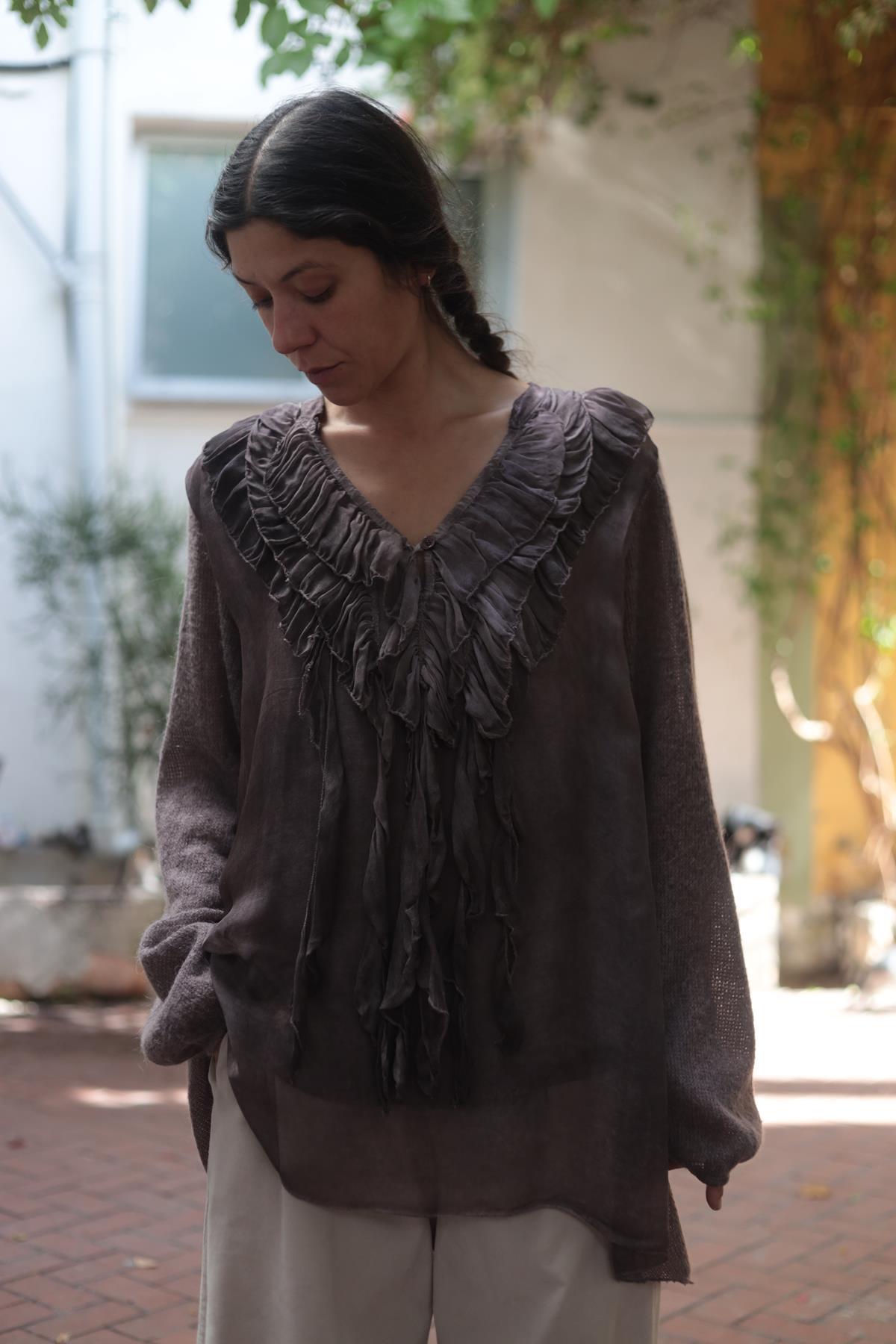 Kahverengi Yakası Fırfırlı Triko Bluz