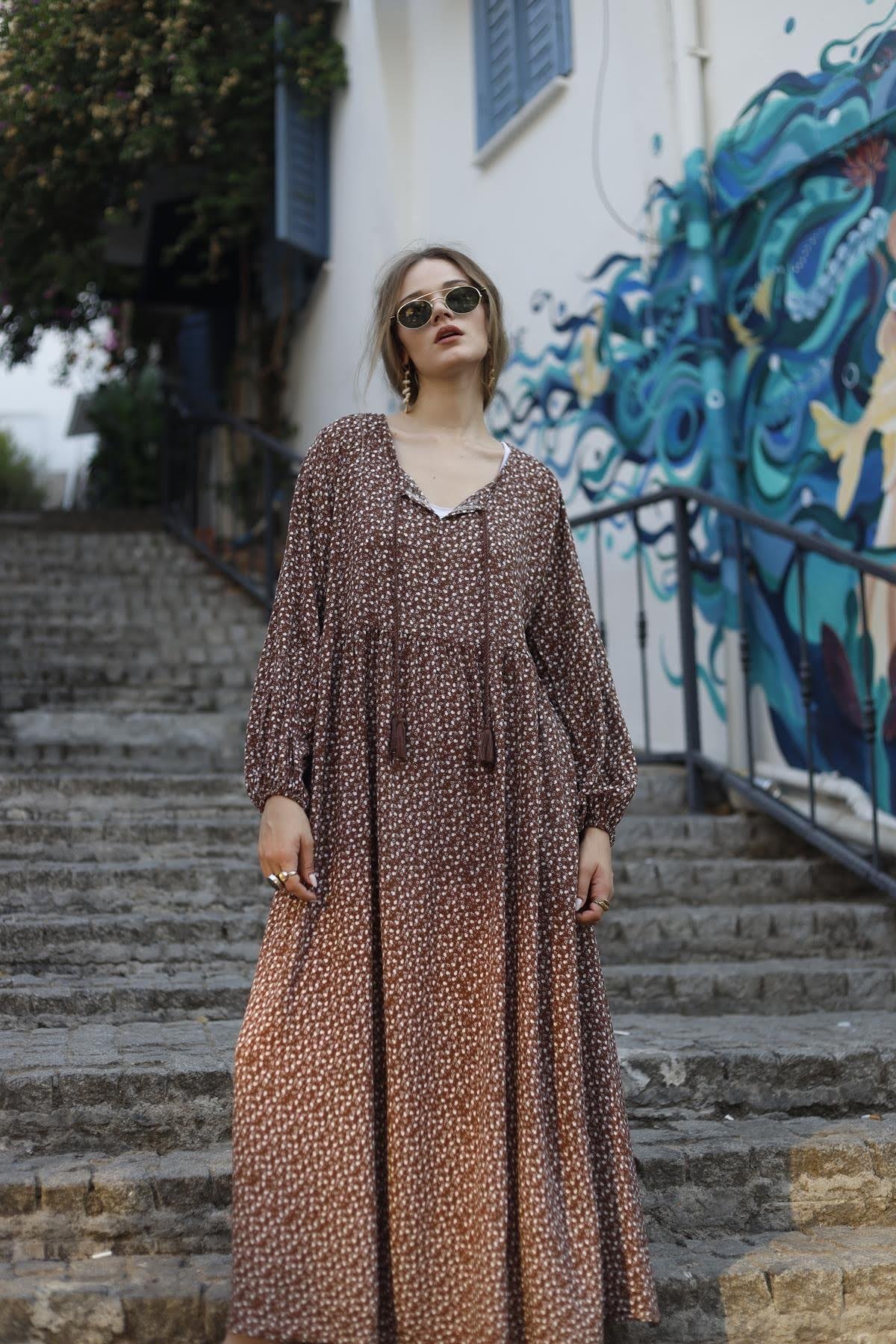 Kahverengi Yakası Püsküllü Çiçekli Elbise