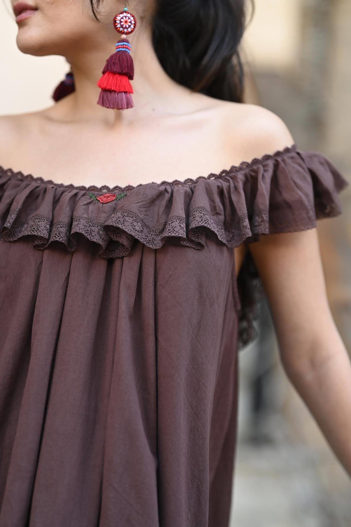 Kahverengi Yakası Volanlı Dantelli Nakışlı Mini Elbise (KE-IH-039-PA-KA-XS)