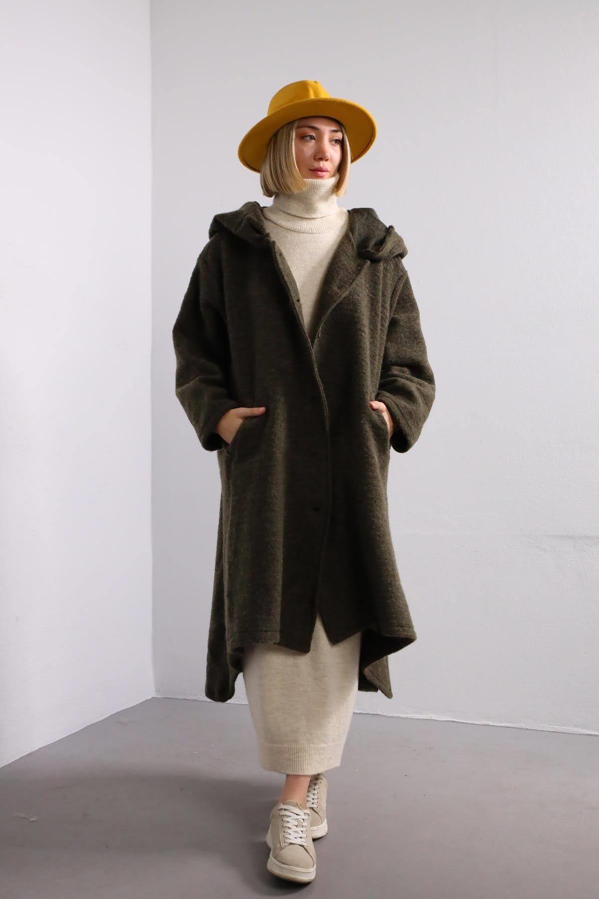 Haki Sırt Detaylı Kapüşonlu Keçe Kaban