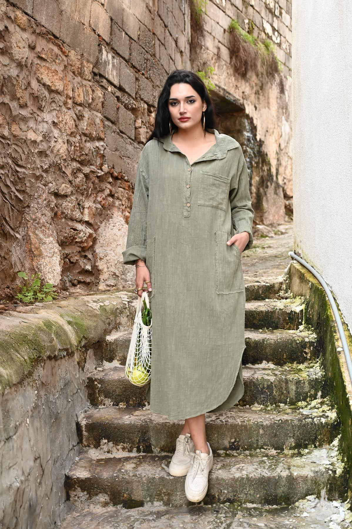 Haki Gömlek Yaka Dikiş Detaylı Cepli Elbise