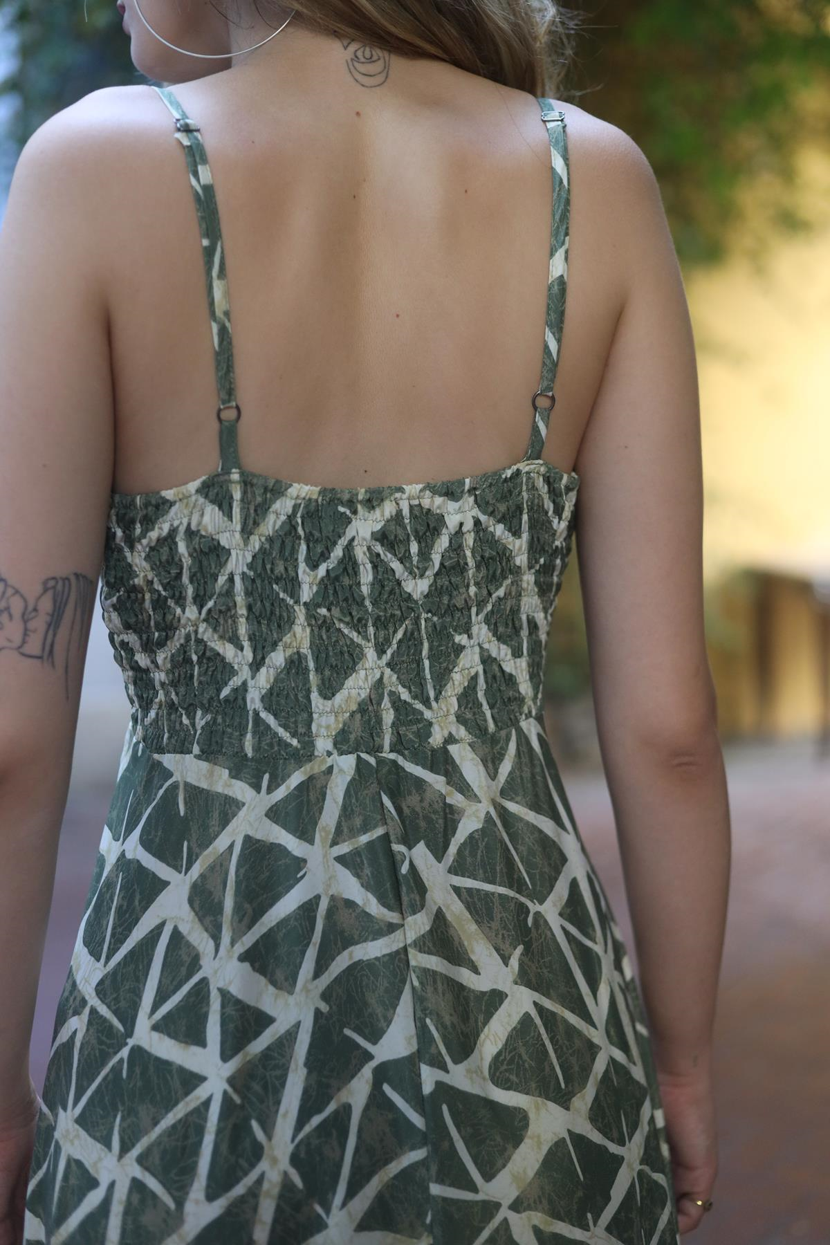 Khaki Patterned Strappy Silk Dress