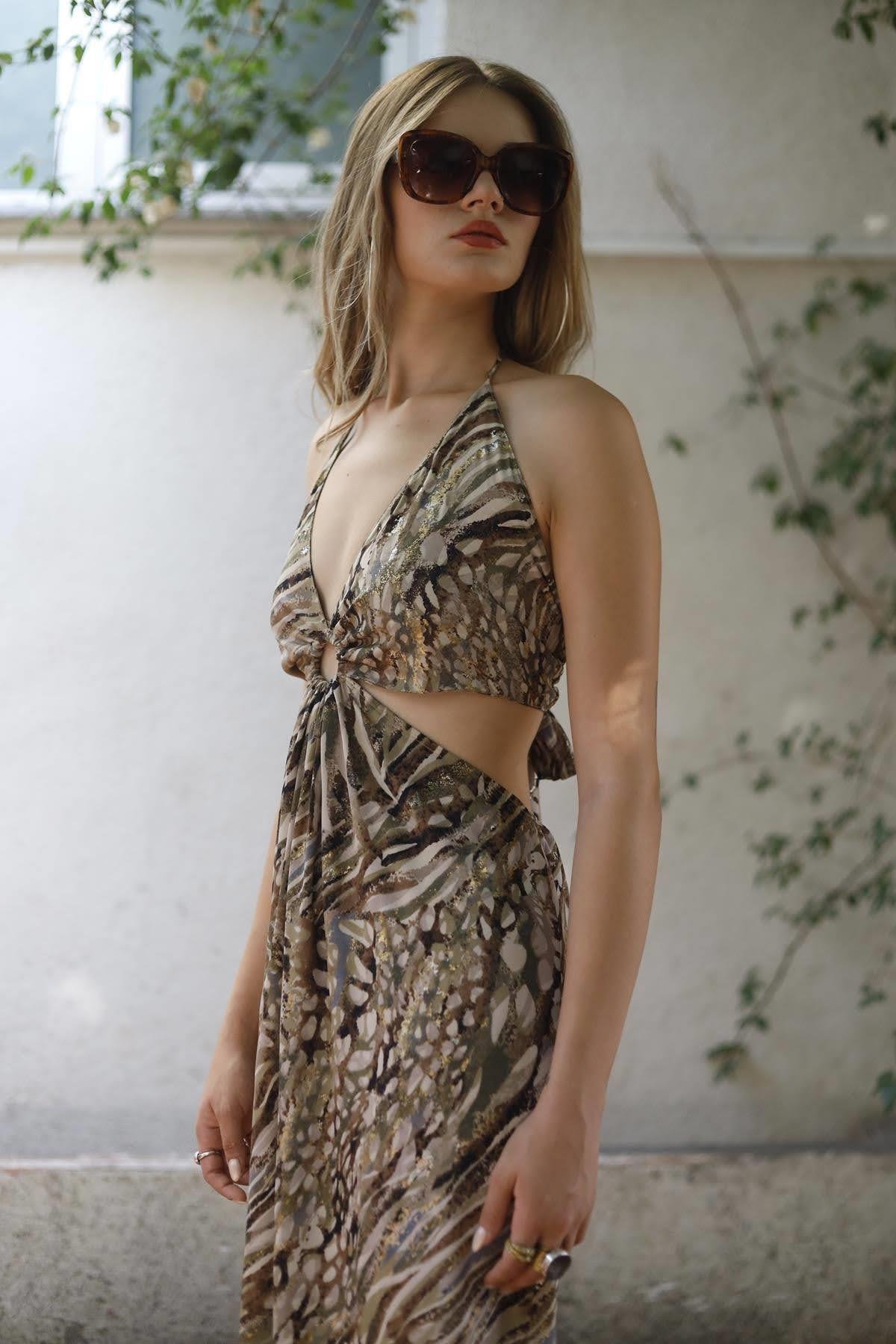 Khaki Strappy Backless Silk Dress (KE-RMR-056-IP-HA-STD)