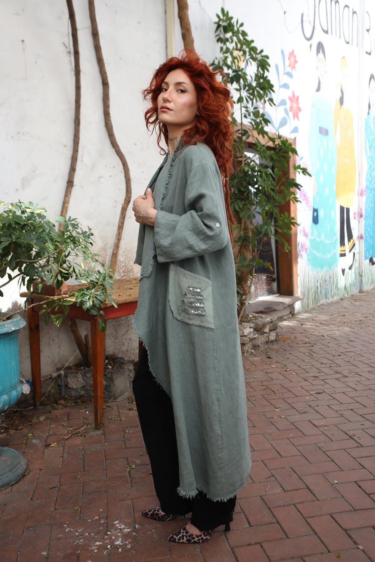 Standard size, fits size range 36-44. Model Height and Weight: 168 cm, 50 kg Fabric: 100% Linen