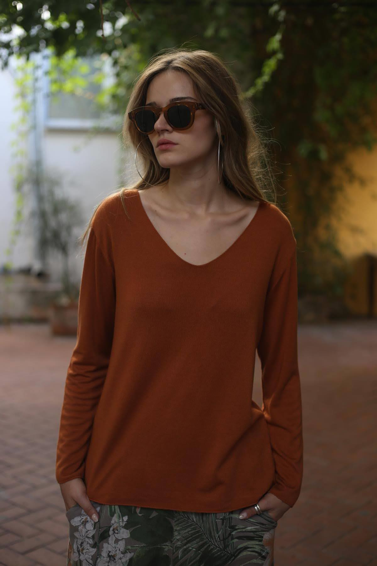 Kiremit Rengi Yumuşak Doku V Yaka Bluz