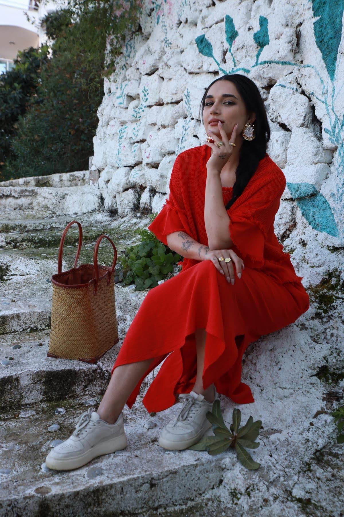 Kırmızı File Bluz Detaylı Askılı Elbise (KE-PM-055-KTN-KI-STD)