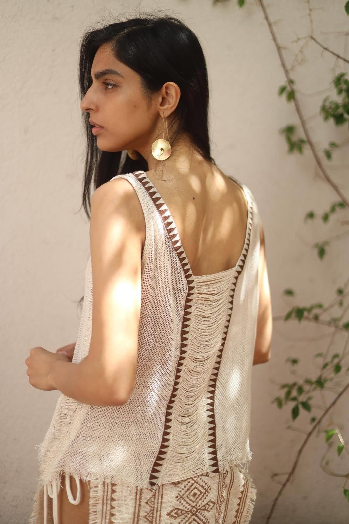 Krem Rengi Askılı Parça Detaylı File Bluz