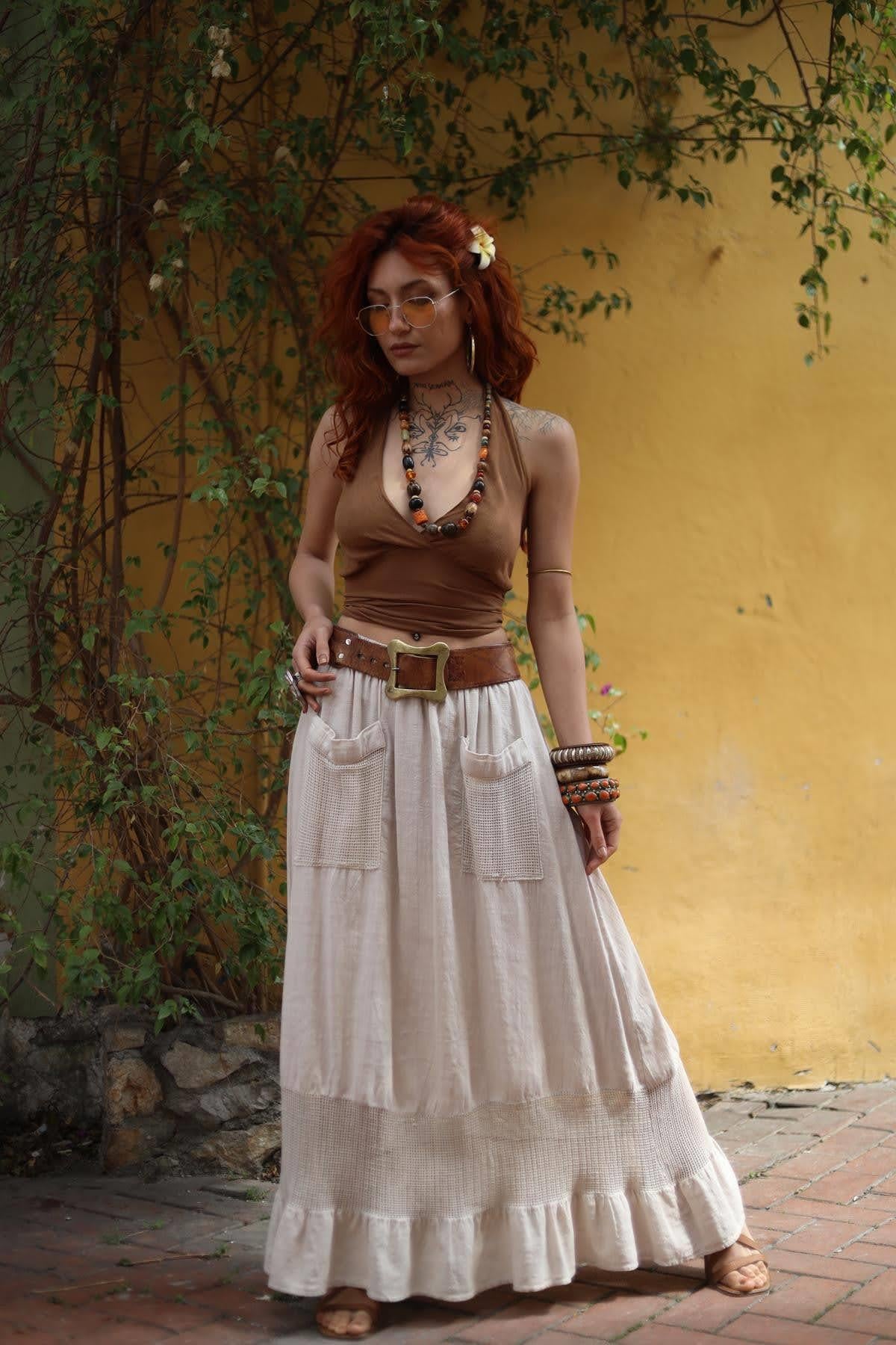 Krem Rengi Beli Lastikli Cepli Fileli Etek