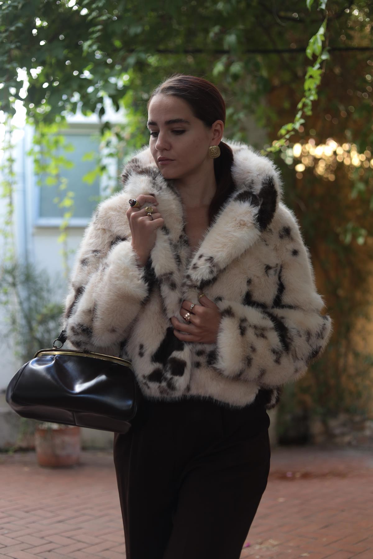 Krem Rengi Benekli Kısa Kürk Kaban