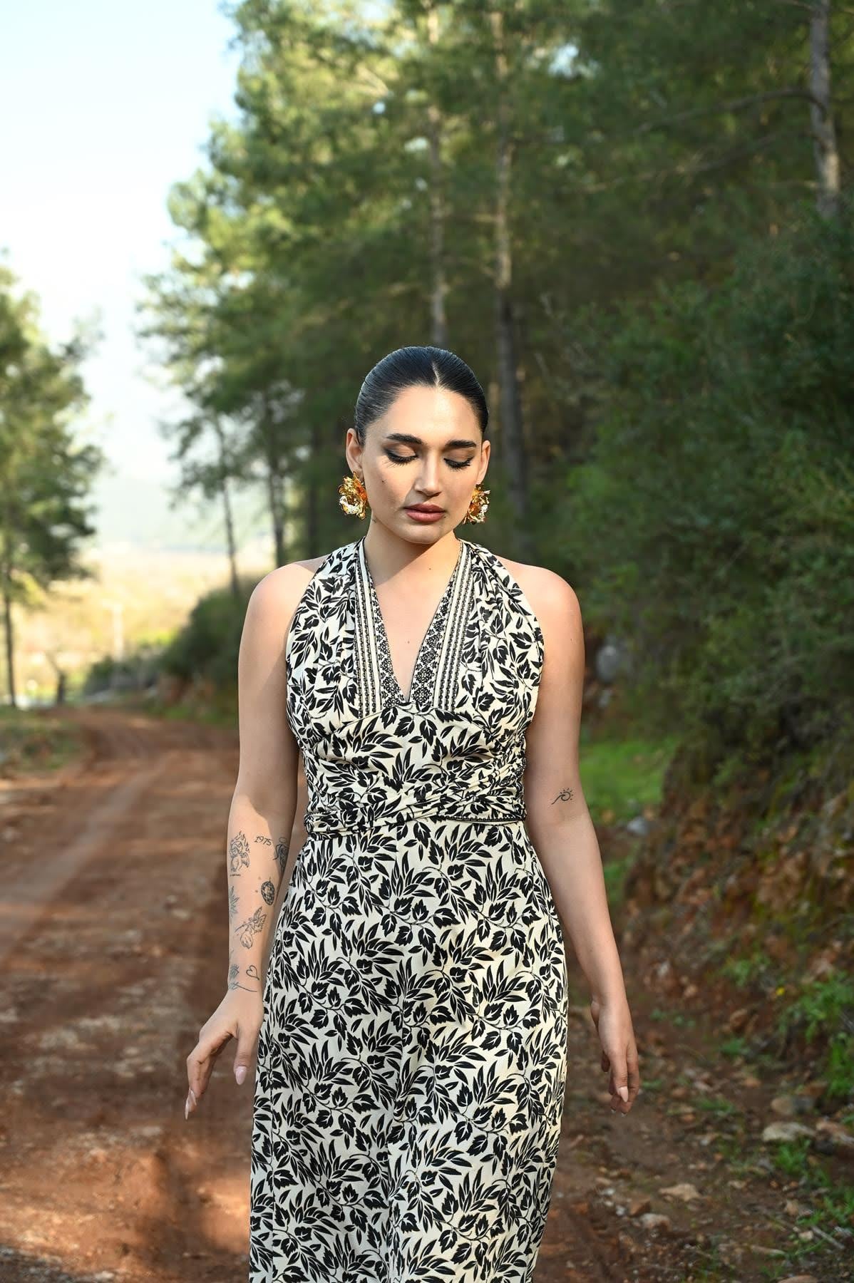 Krem Rengi Boyundan Bağlamalı Evaze Etek İpek Elbise