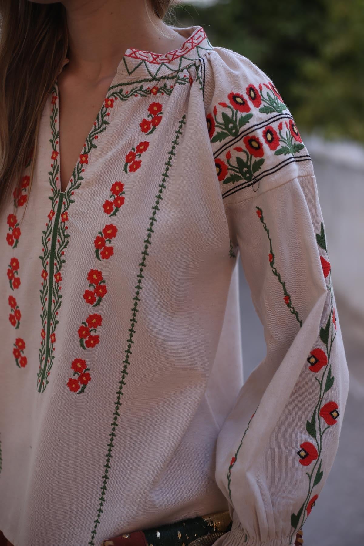 Krem Rengi Çiçek İşlemeli Kolu Lastikli Bluz