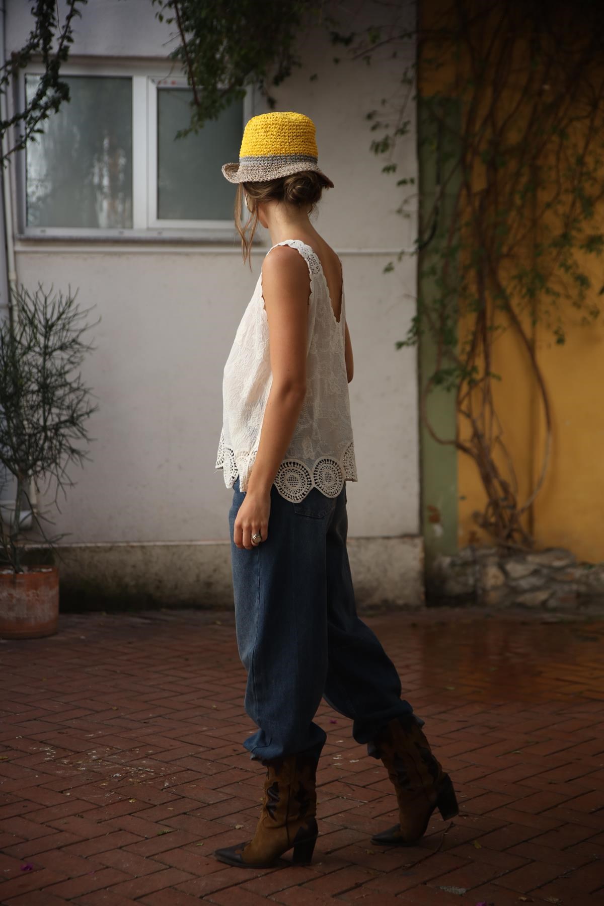 Krem Rengi Dantel Askılı Nakışlı Bluz