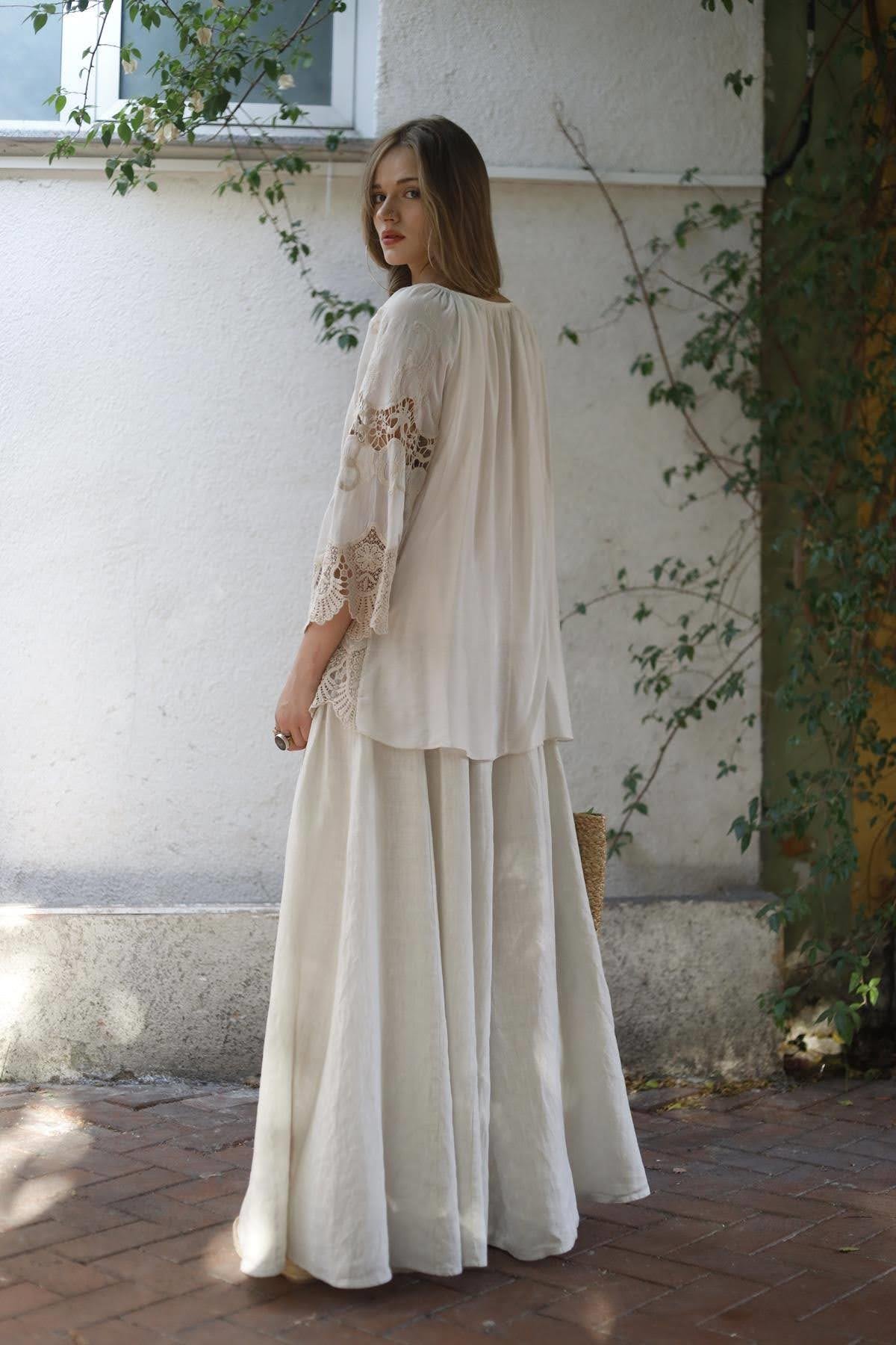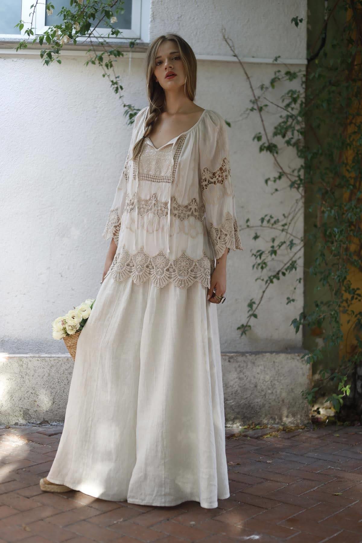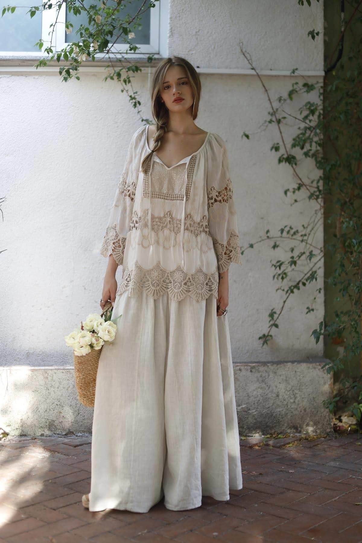 Krem Rengi Dantelli Payet Detaylı İpek Bluz
