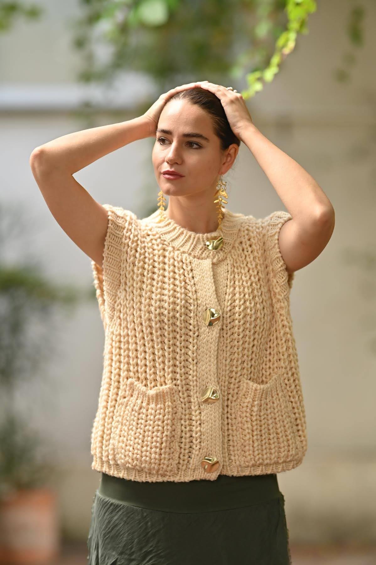Krem Rengi Düğme Detaylı Örme Yelek
