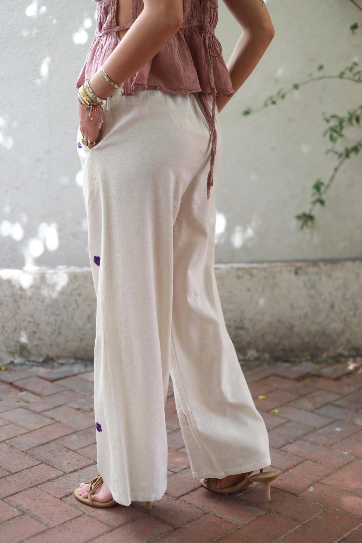 Krem Rengi Kendinden Kareli Nakışlı Pantolon
