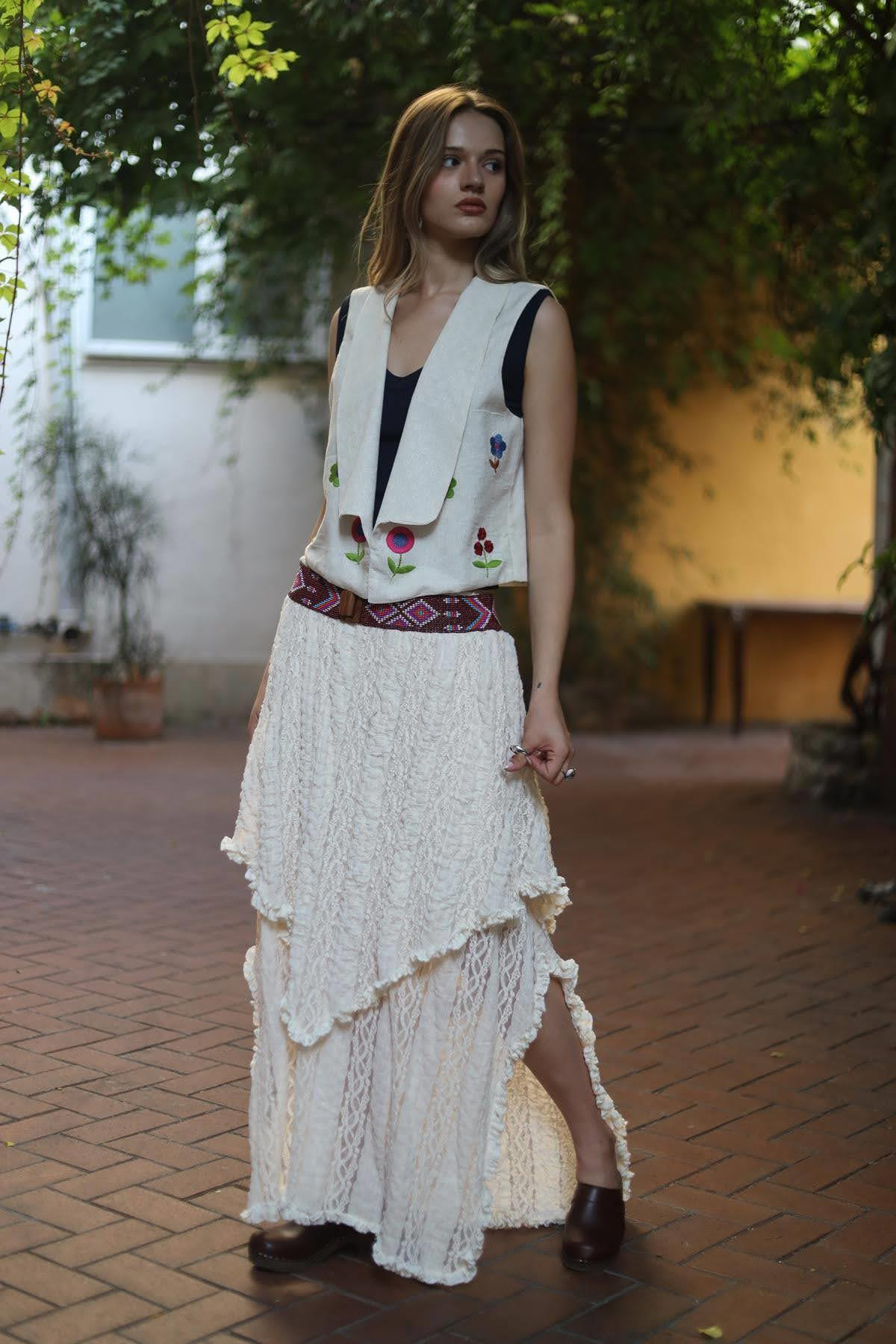 Krem Rengi Kendinden Kareli Nakışlı Yelek