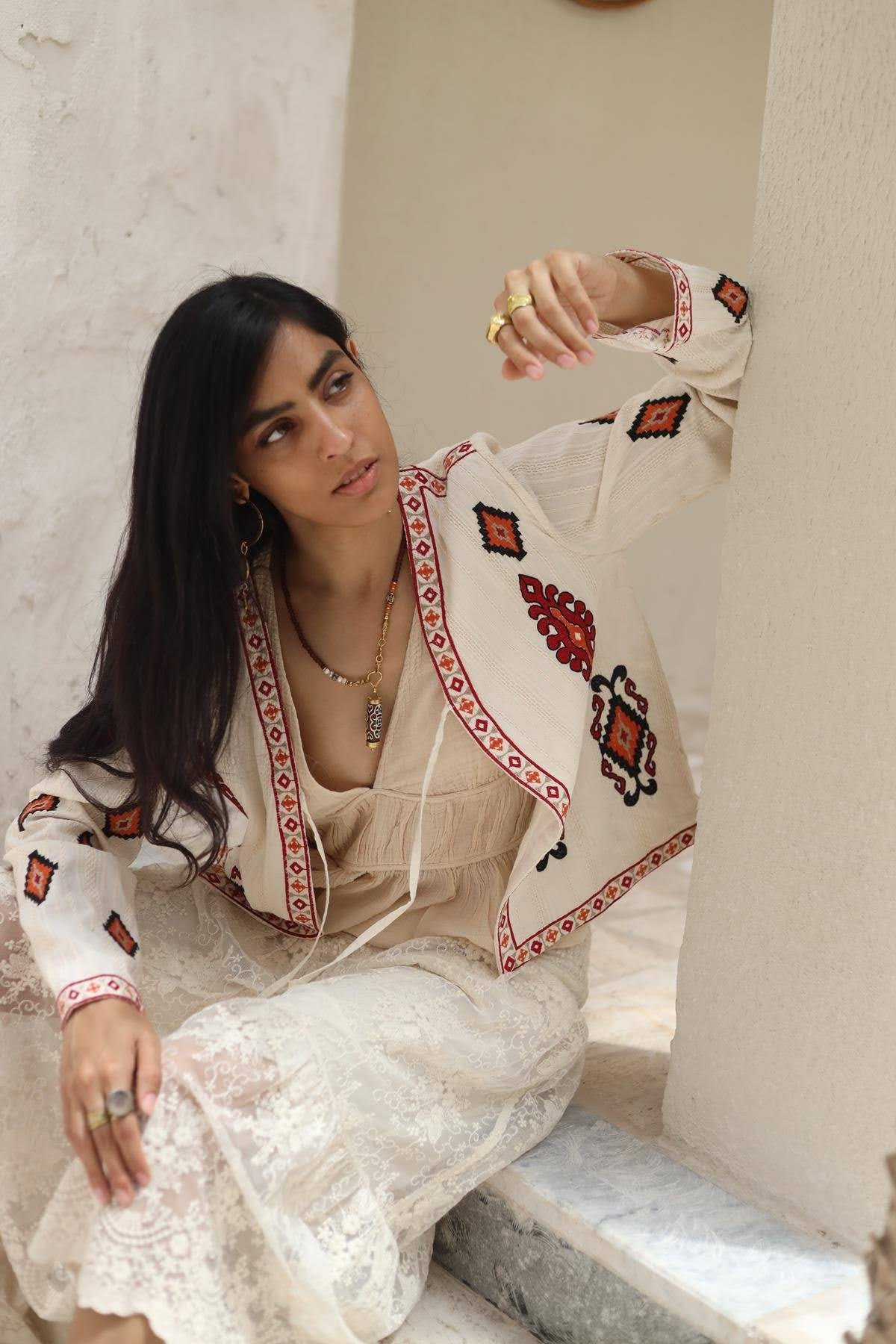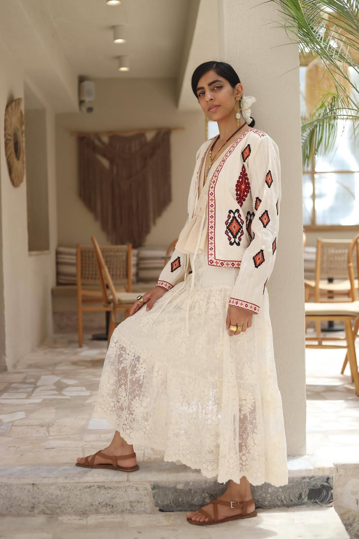 Krem Rengi Nakışlı Önü Bağlamalı Otantik Ceket