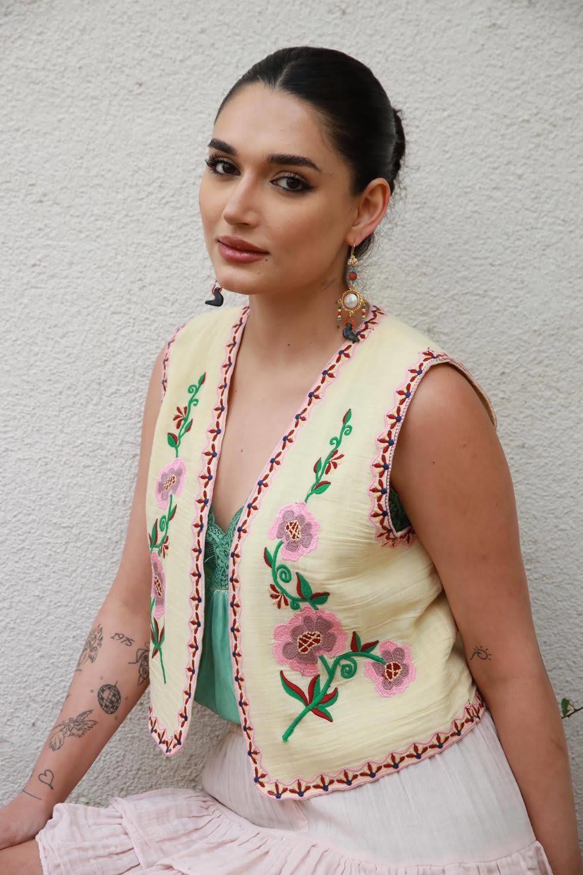 Krem Rengi Nakışlı Yelek