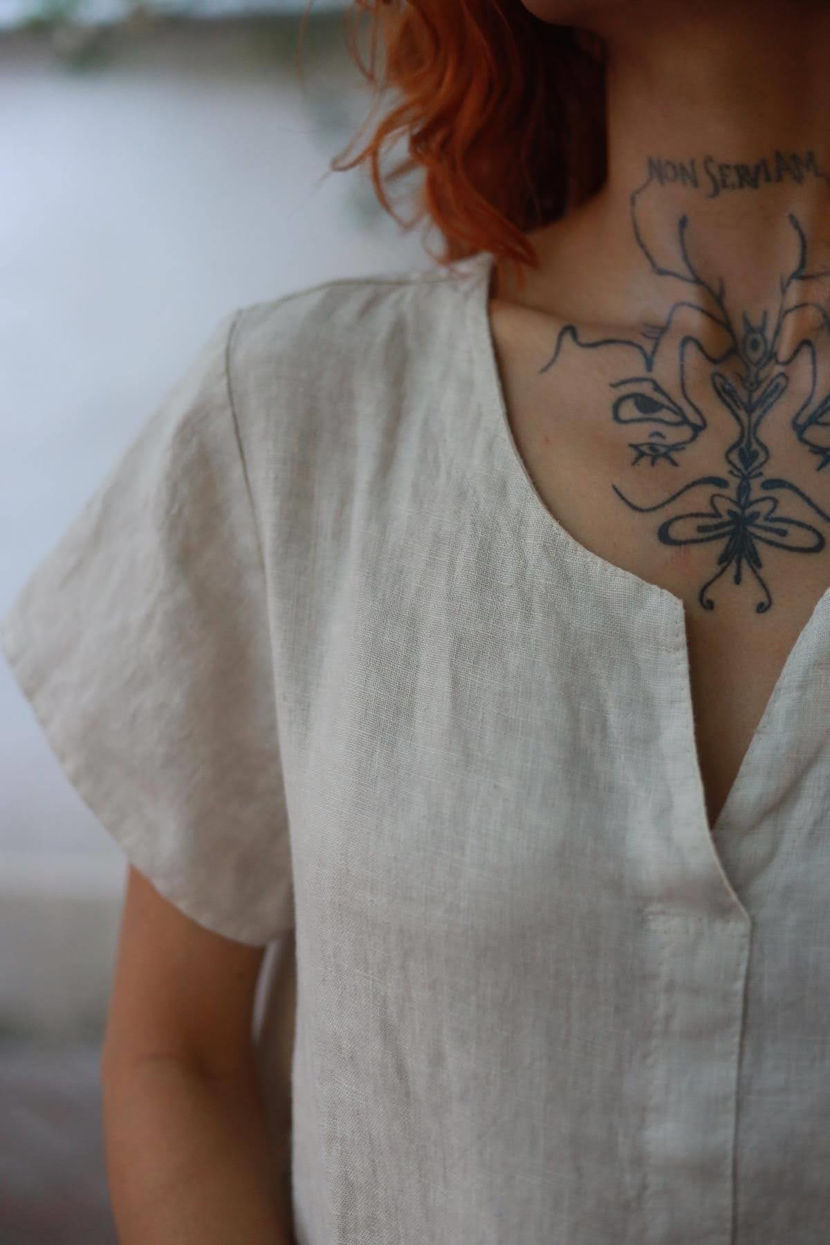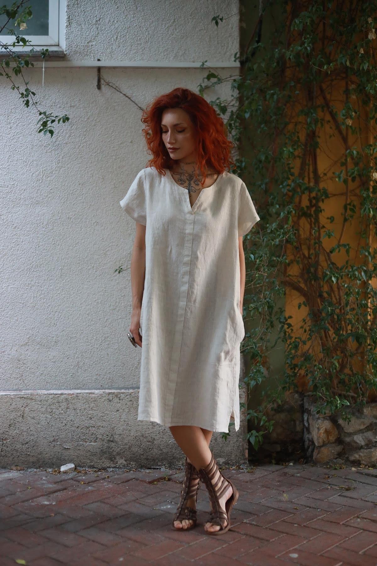 Krem Rengi Önü Dikişli Cepli Midi Keten Elbise