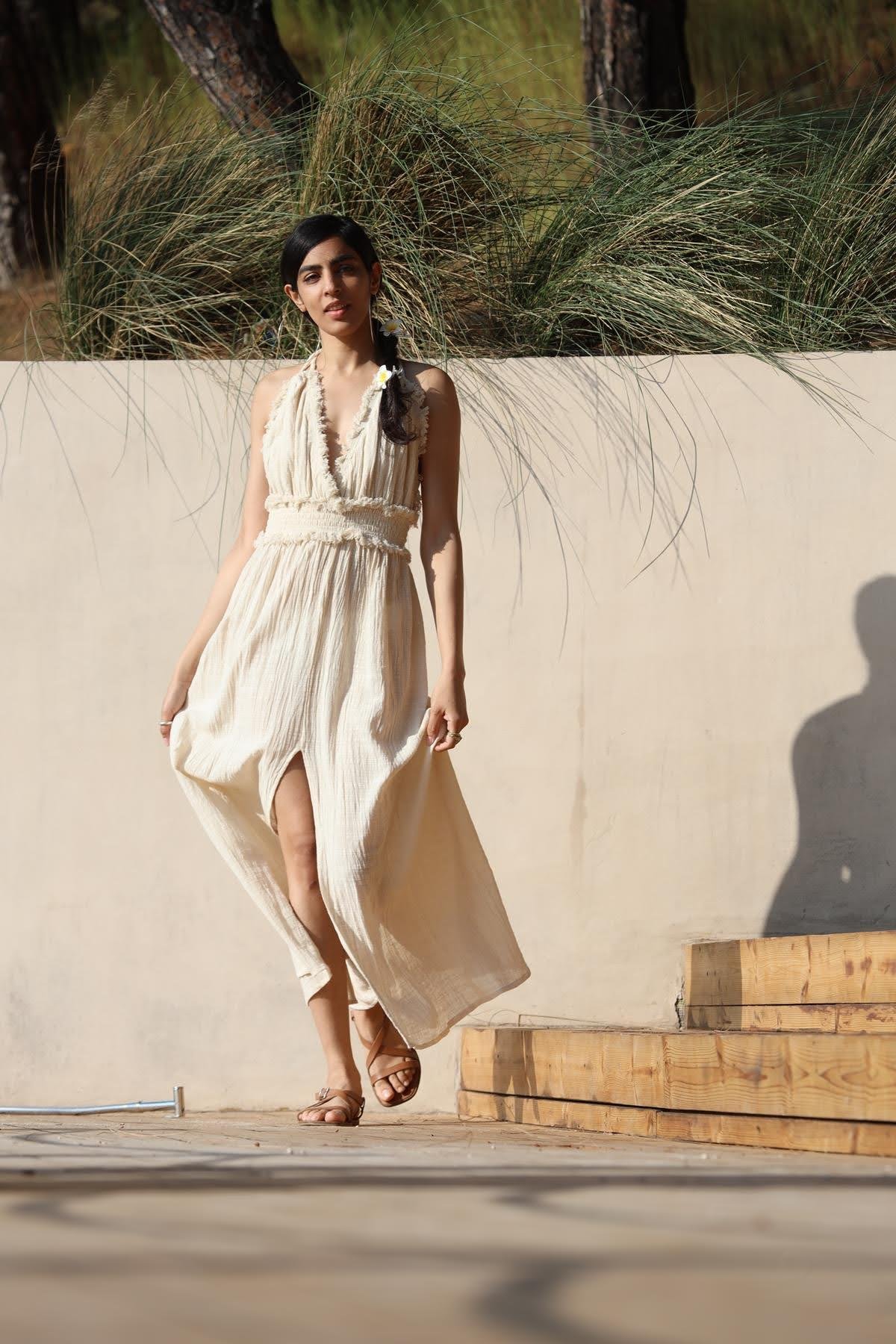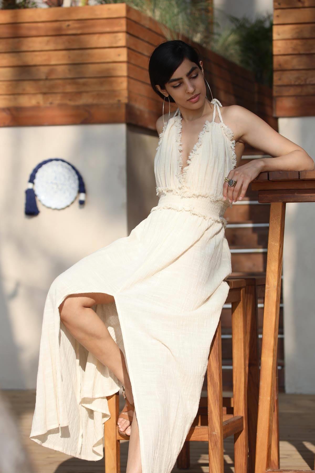 Krem Rengi Örgü Askılı Beli Gipeli Yırtmaçlı Elbise (KE-RMR-058-PA-KR1-STD)