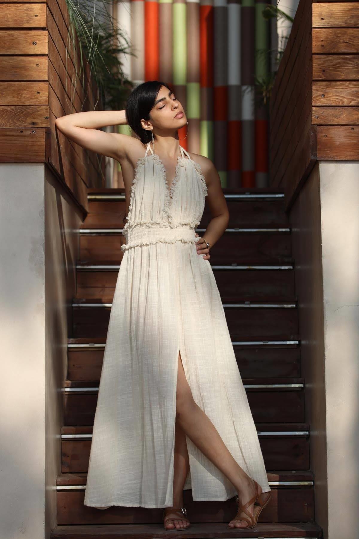 Krem Rengi Örgü Askılı Beli Gipeli Yırtmaçlı Elbise