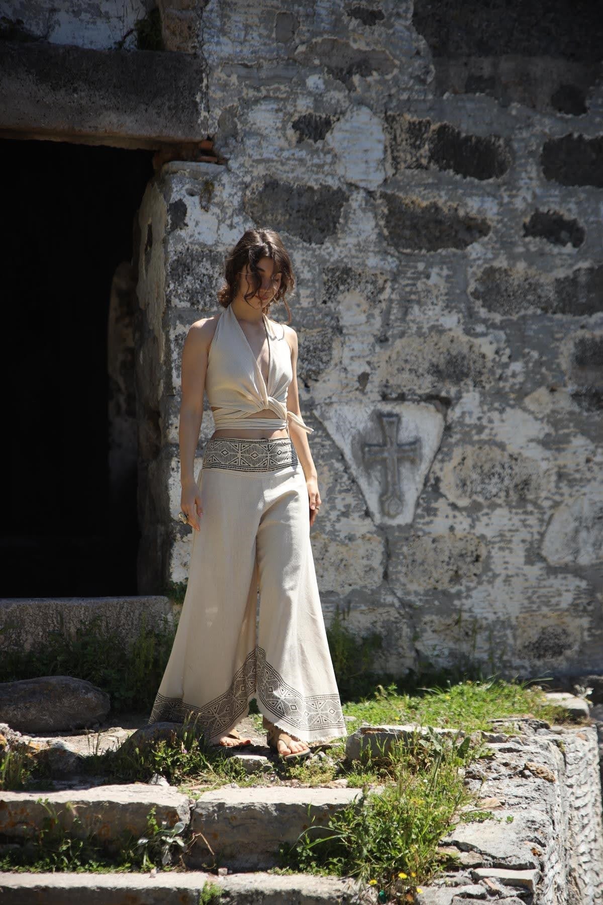 Krem Rengi Paçası Desenli Asimetrik Kesim Pantolon (KP-RMR-006-PA-KR-STD)