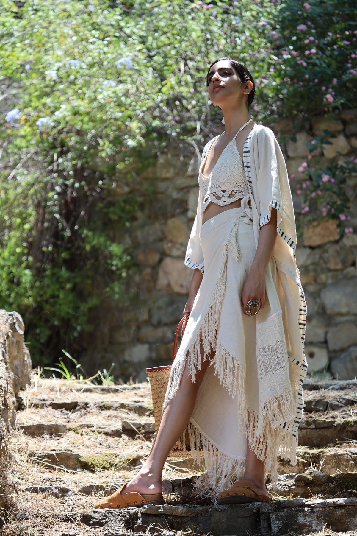 Krem Rengi Püsküllü Anvelop Etek