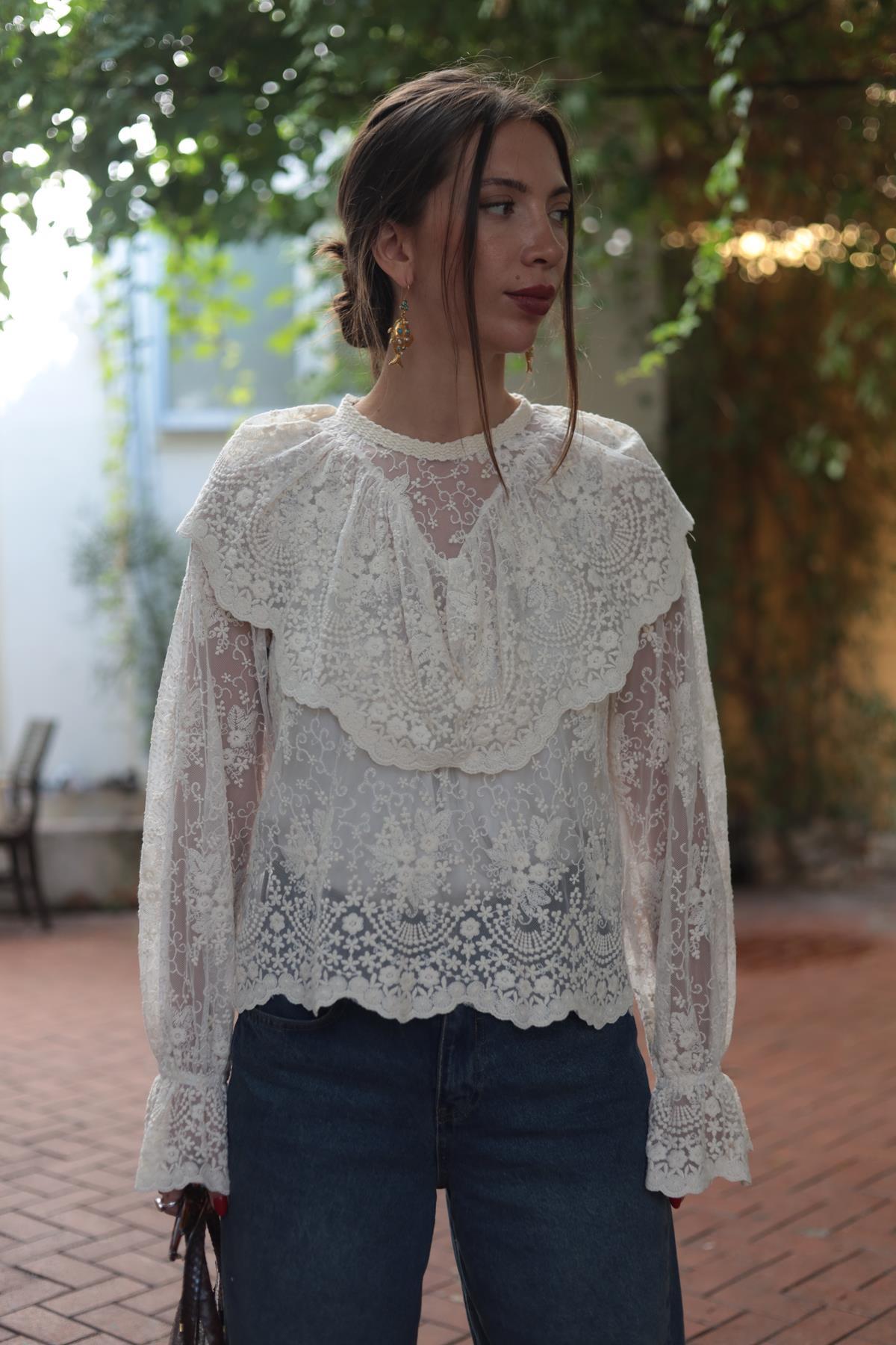 Krem Rengi Yakası Volanlı Güpür Bluz