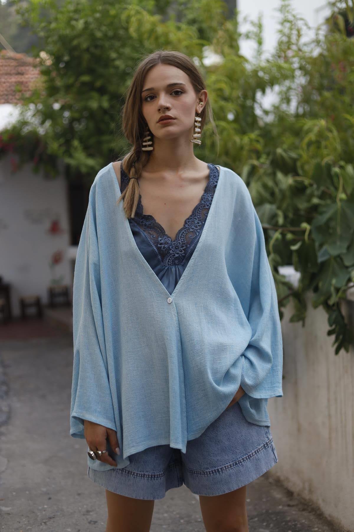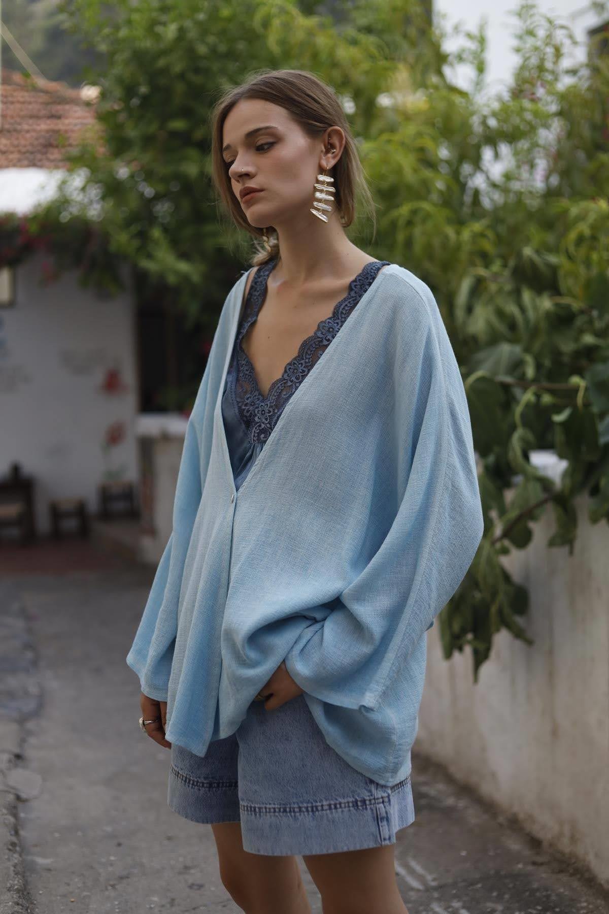 Light Blue Single Button Linen Cardigan (KH-FAL-002-KTN-AMA-STD)