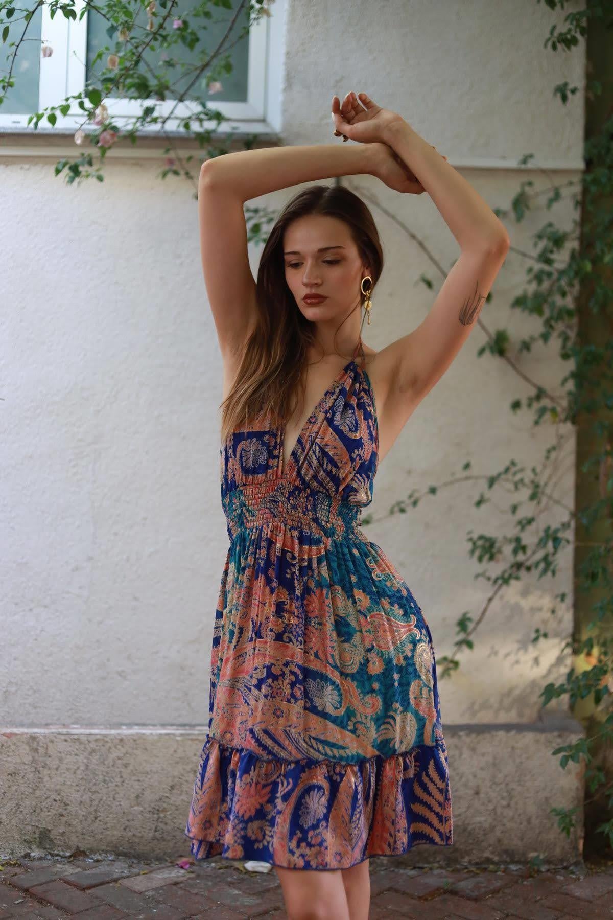 Mavi Bağlamalı Sırt Dekolteli Mini İpek Elbise