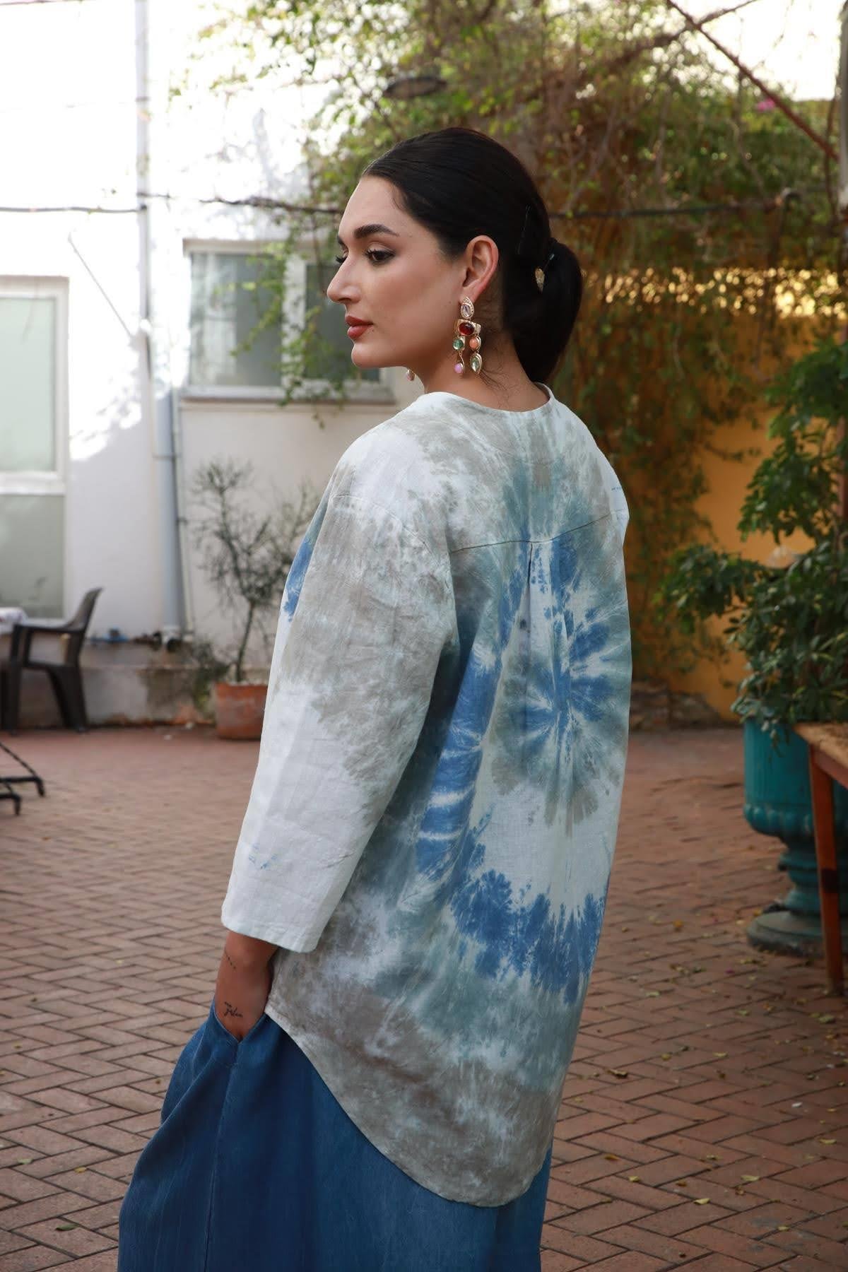 Mavi Batik Desenli Tek Düğmeli Keten Bluz