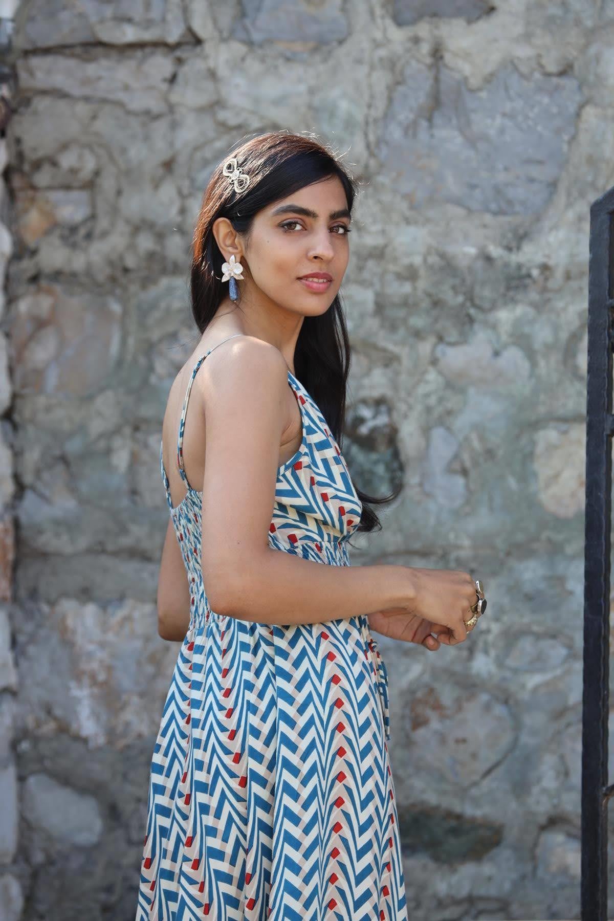Mavi Desenli Sırtı Gipeli Kruvaze Yaka Askılı Elbise