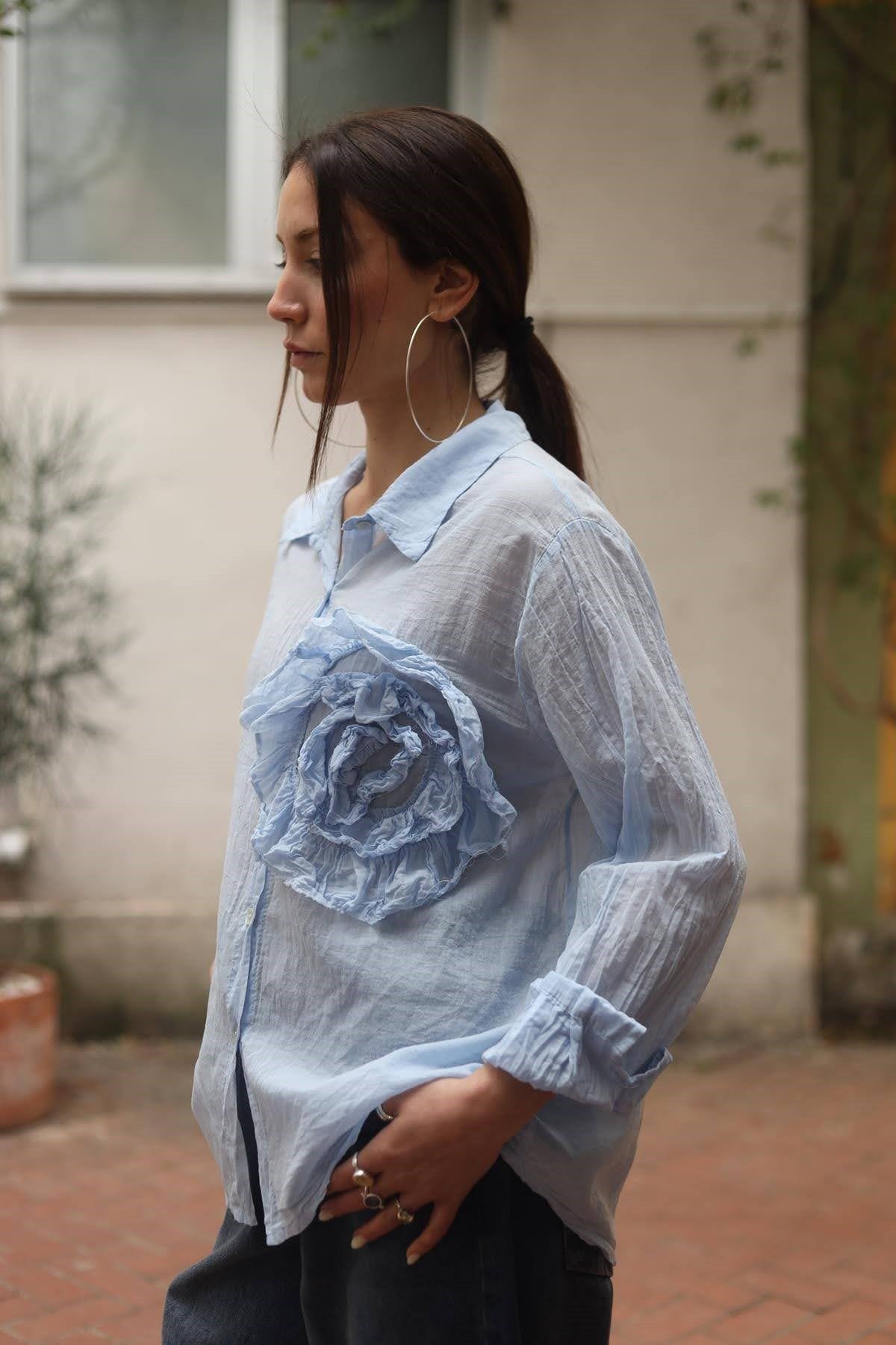 Mavi Gül Volanlı Gömlek