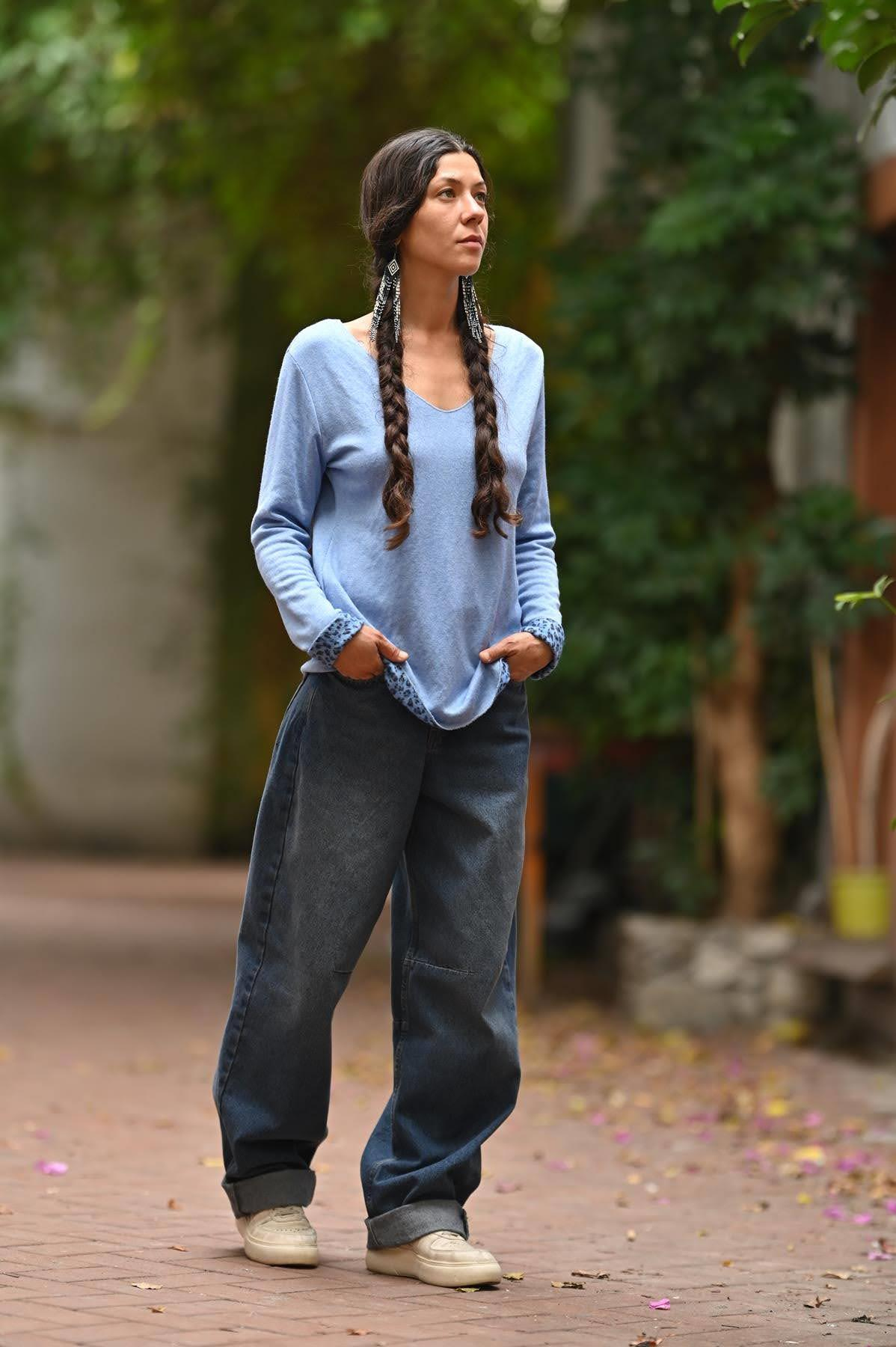 Mavi V Yaka İçi Leopar Desenli Triko Bluz