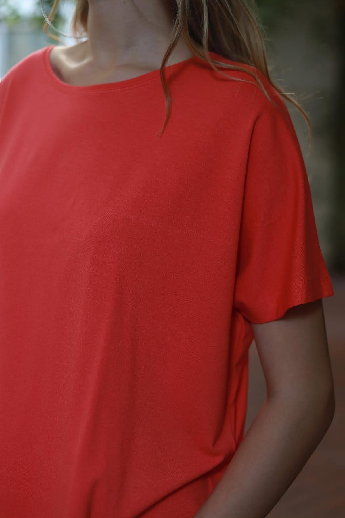Mercan Rengi Kısa Kollu Oval Kesim Salaş Bluz (KB-LAM-025-VI-MER-STD)