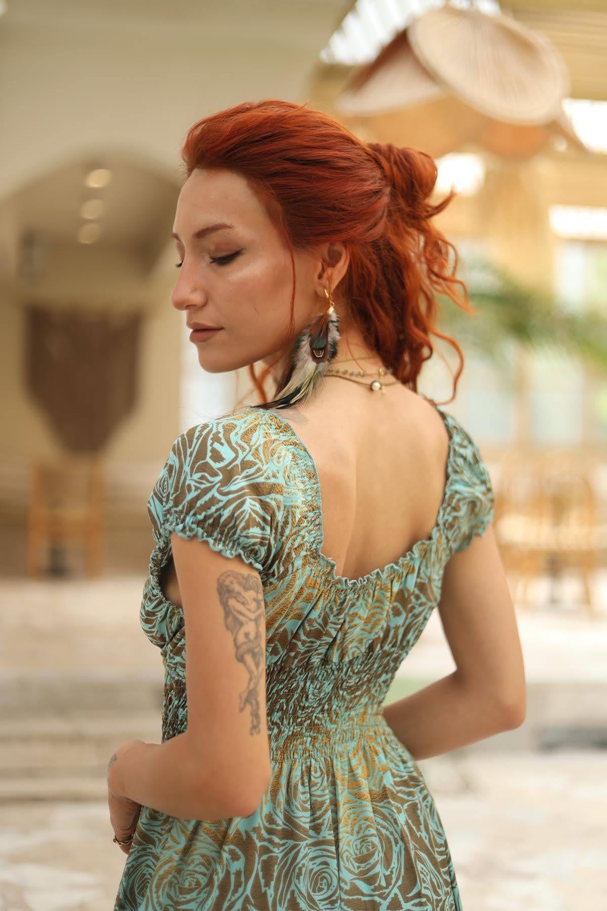 Mint Yeşili Desenli Kalın Askılı Lastikli İpek Elbise (KE-RMR-026-IP-MYE-STD)