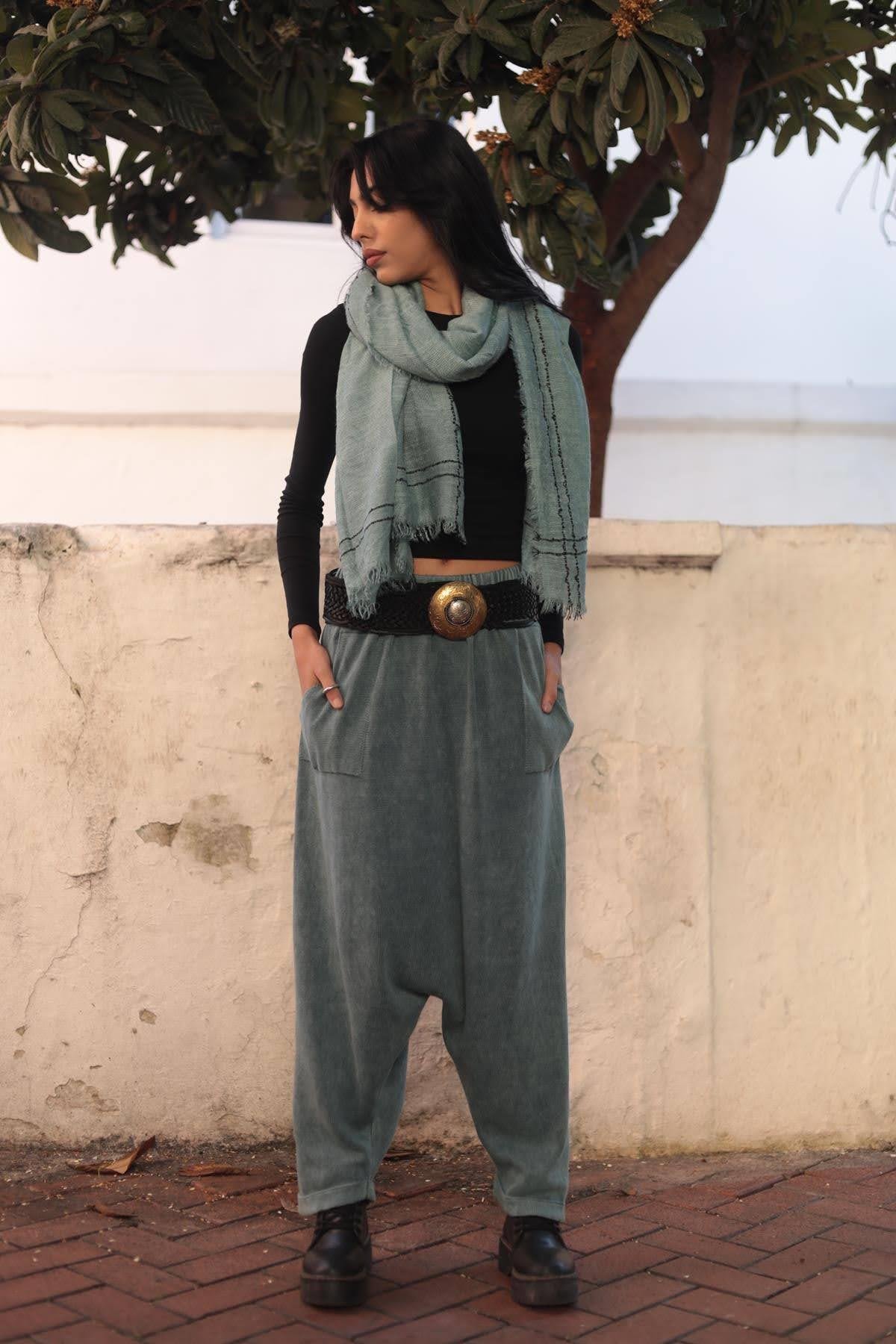 Mint Yeşili Kenarları Çizgili Yünlü Pamuk Şal