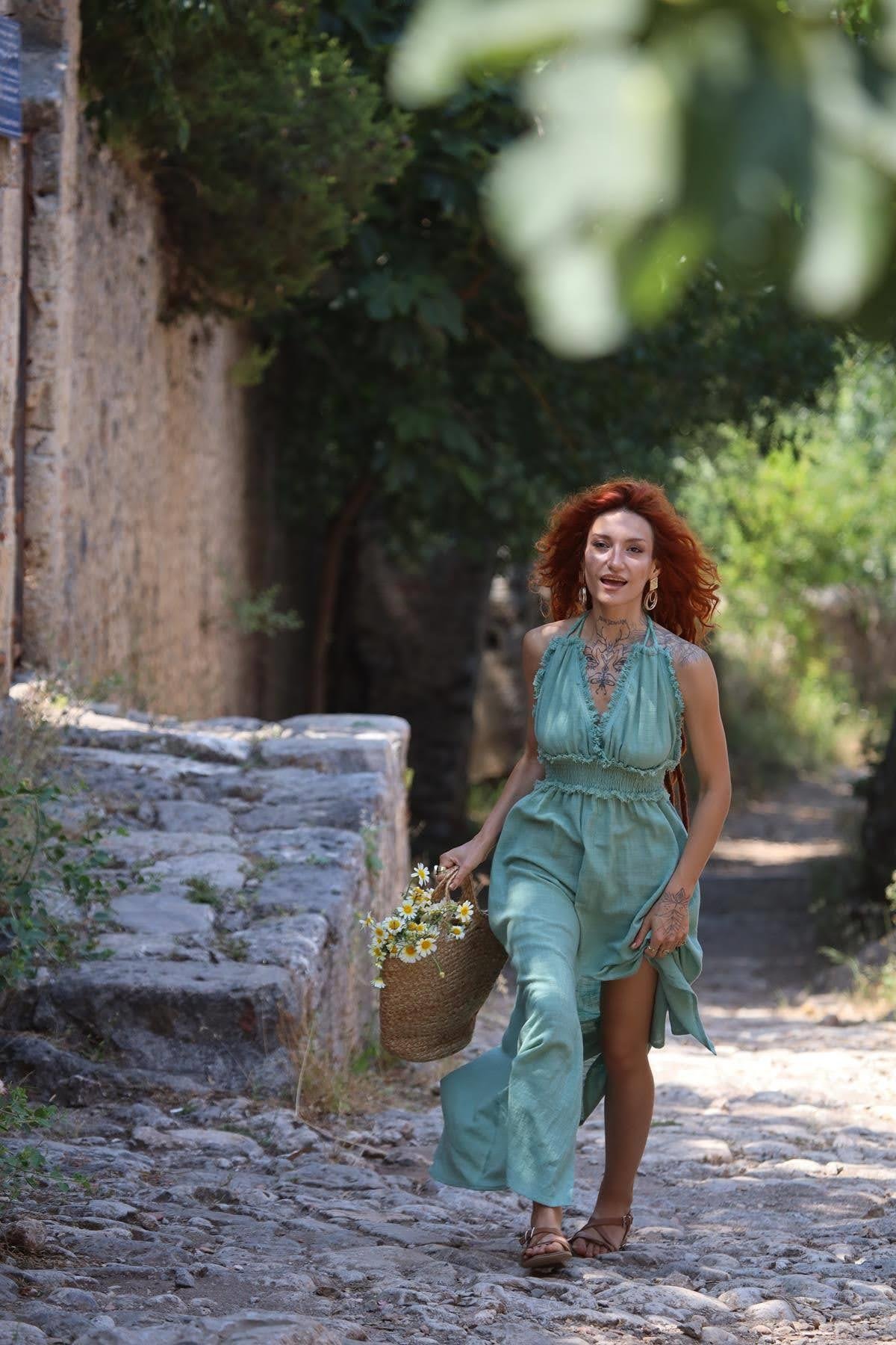 Mint Yeşili Örgü Askılı Beli Gipeli Yırtmaçlı Elbise
