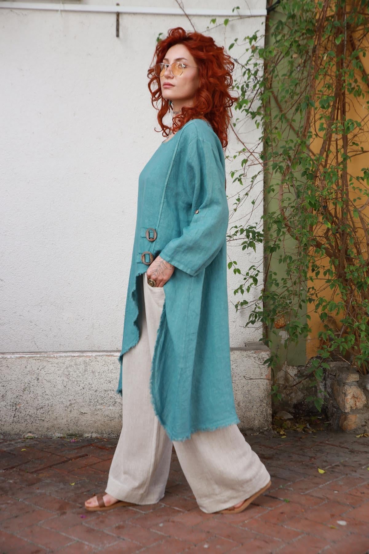 Mint Yeşili Püsküllü Asimetrik Kesim Tokalı Keten Tunik (KTNK-PM-006-KTN-MYE-STD)