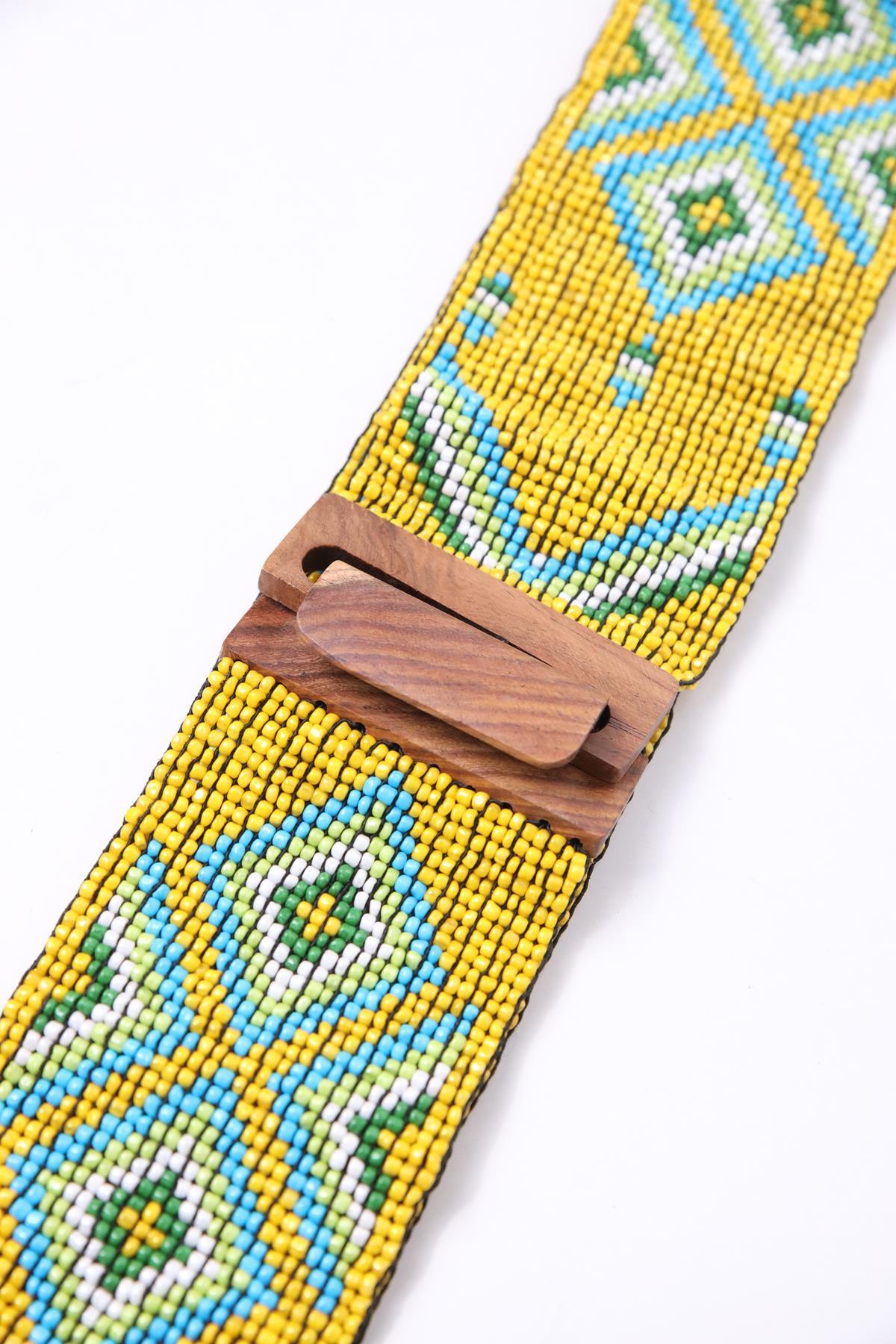 Mustard Color Wooden Buckle Detailed Beaded Elastic Belt (AKE-AS-005-PO-HAR-STD)