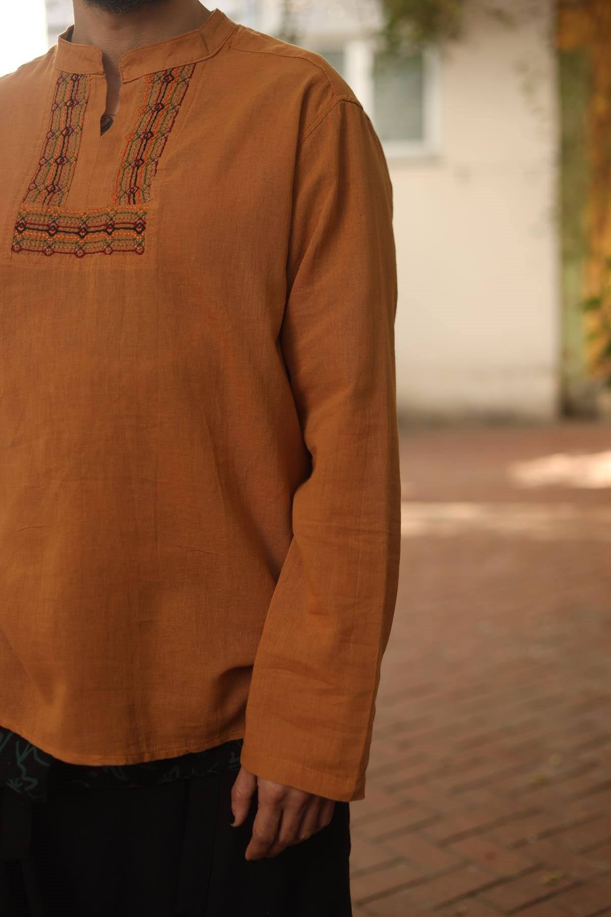 Mustard Mandarin Collar Embroidery Detail Cotton Shirt (EG-TO-005-PA-HAR-S)